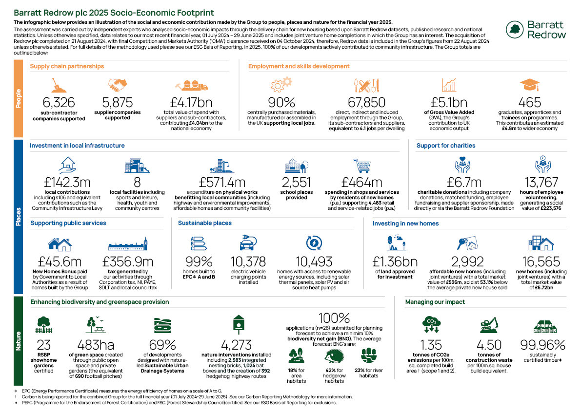 Our business makes a significant contribution to the UK economy and the communities in which we operate. Each year, Socio-Economic Footprints are created at a group, regional and divisional level to demonstrate this contribution. The footprints are aligned to our Building Sustainably Framework pillars: Nature, Places and People and reflect the breadth of value that our business creates, including, our positive social, environmental, and economic contributions.