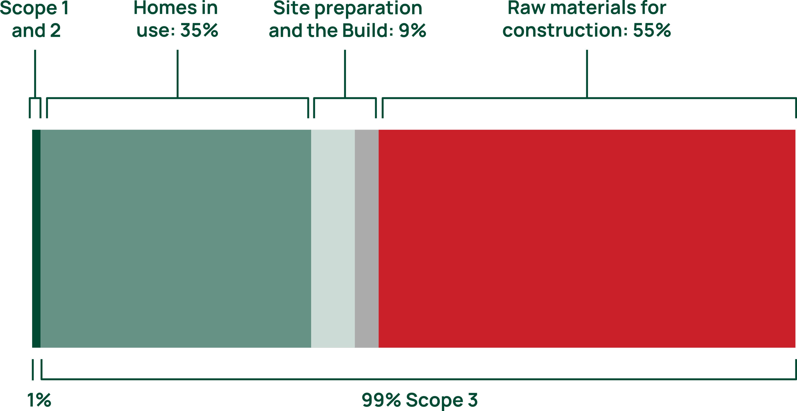 Understanding where our emissions come from is essential for targeted decarbonisation efforts. Less than 1% of the Group’s emissions are produced as a result of our direct operational activities. The remaining (99%) comes from the transformation of raw materials into products, transport to sites, site preparation and groundworks, and the emissions arising from energy use of the homes we build over their lifetime.